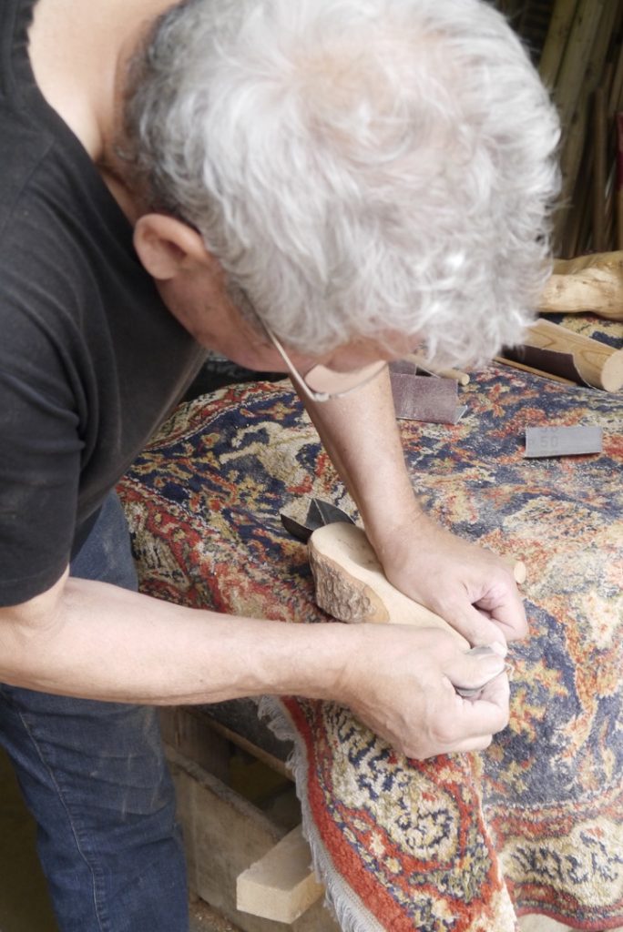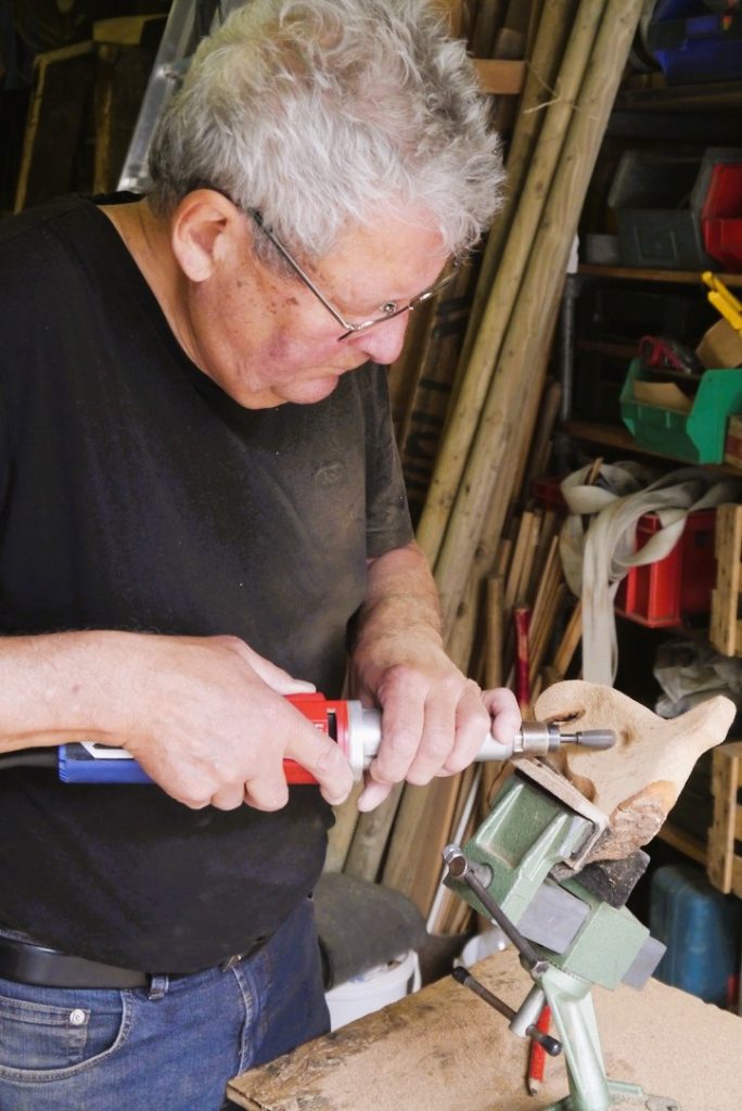 Der Workshop-Tag fängt morgens damit an, dass man sich sein persönliches Stück Holz aus einem großen Korb aussucht. Am Vormittag wird es  grob mit dem Maschinenraspel bearbeitet und im Anschluss mit Schleifpapier und Handraspel kommt der Feinschliff. Der Abschluss des Tages ist ein persönliches Kunstwerk.